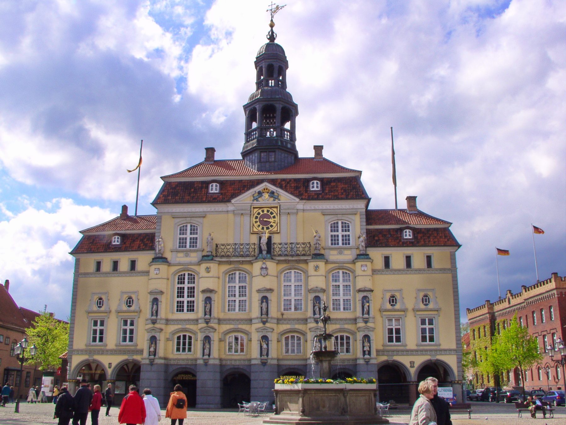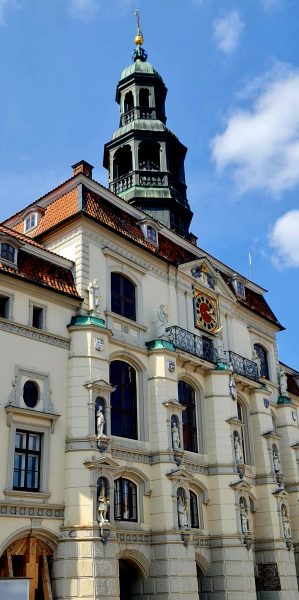 Das historische Rathaus Lüneburgs am Marktplatz, ab 1230 erbaut, ist das größte mittelalterliche Rathaus im Norden. Es vereint Elemente verschiedener Stilepochen. Die üppige Barockfassade wird von zehn hohen Figuren: Die der oberen Reihe stehen für Barmherzigkeit, Milde, Wahrheit, Strenge und Klugheit, die der unteren Reihe für Frieden, Handel, Gerechtigkeit, Mäßigung und Stärke.