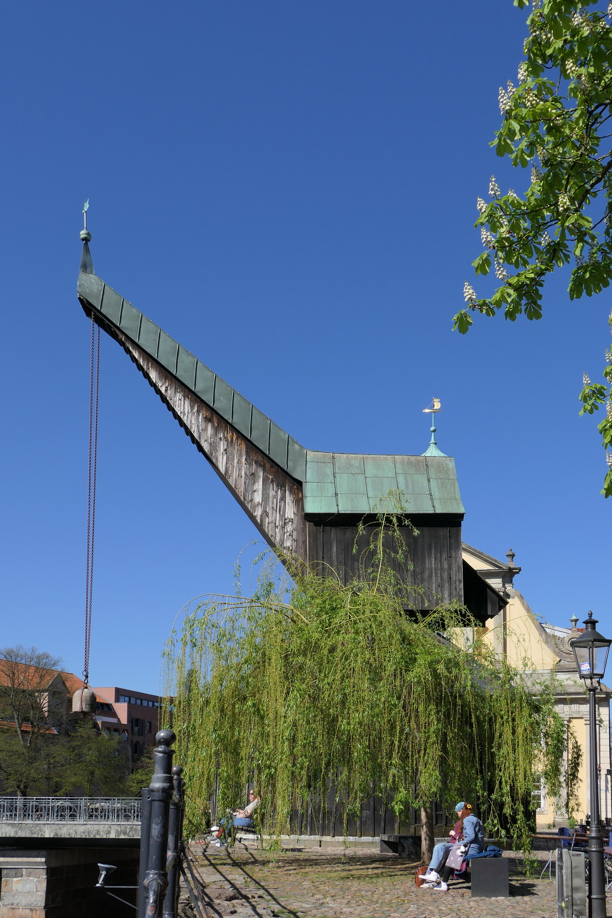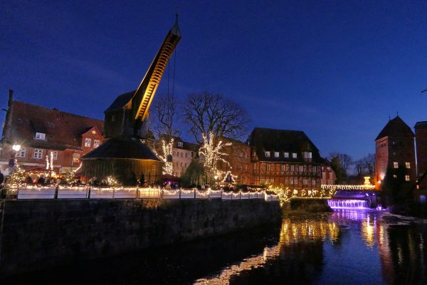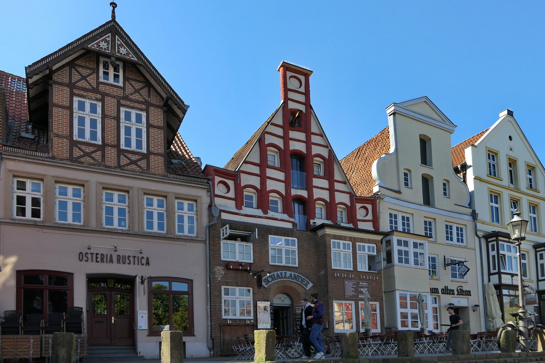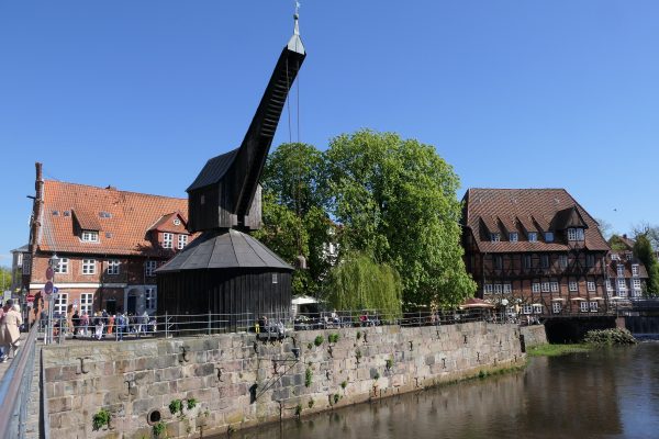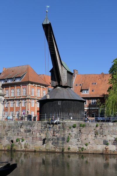 Das auffälligste Wahrzeichen am Stintmarkt ist der Alte Kran, eines der zwei Wahrzeichen der Stadt (zusammen mit dem Wasserturm). Er stammt ursprünglich aus dem 14. Jahrhundert und wurde in seiner heutigen Form 1797 errichtet. Seine Funktion war zentral für den Reichtum Lüneburgs: Der Kran diente dazu, schwere Güter – vor allem Salz – auf Schiffe zu verladen oder zu entladen. Salz war im Mittelalter das „weiße Gold“ der Stadt und machte Lüneburg zu einer der wichtigsten Handelsmetropolen Norddeutschlands. Technisch war der Kran ein Meisterwerk seiner Zeit: Große Treträder, die von Menschen angetrieben wurden, setzten die Hebemechanik in Bewegung. Am 13. August 1840 hob der Kran seine schwerste Last an Land: eine 9,3 Tonnen schwere Dampflokomotive, die in England gebaut und auf dem Wasserweg nach Deutschland transportiert worden war. Heute ist der Kran eines der bekanntesten Fotomotive der Stadt.