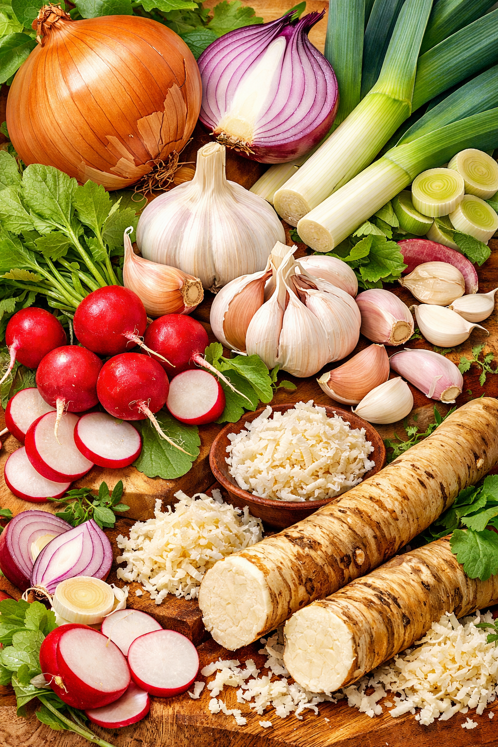 • Zwiebeln und Knoblauch: Sie enthalten schwefelhaltige Verbindungen mit antibakterieller und entzündungshemmender Wirkung. Besonders beliebt bei Husten ist selbstgemachter Zwiebelsirup – ein klassisches Hausmittel zur Schleimlösung.