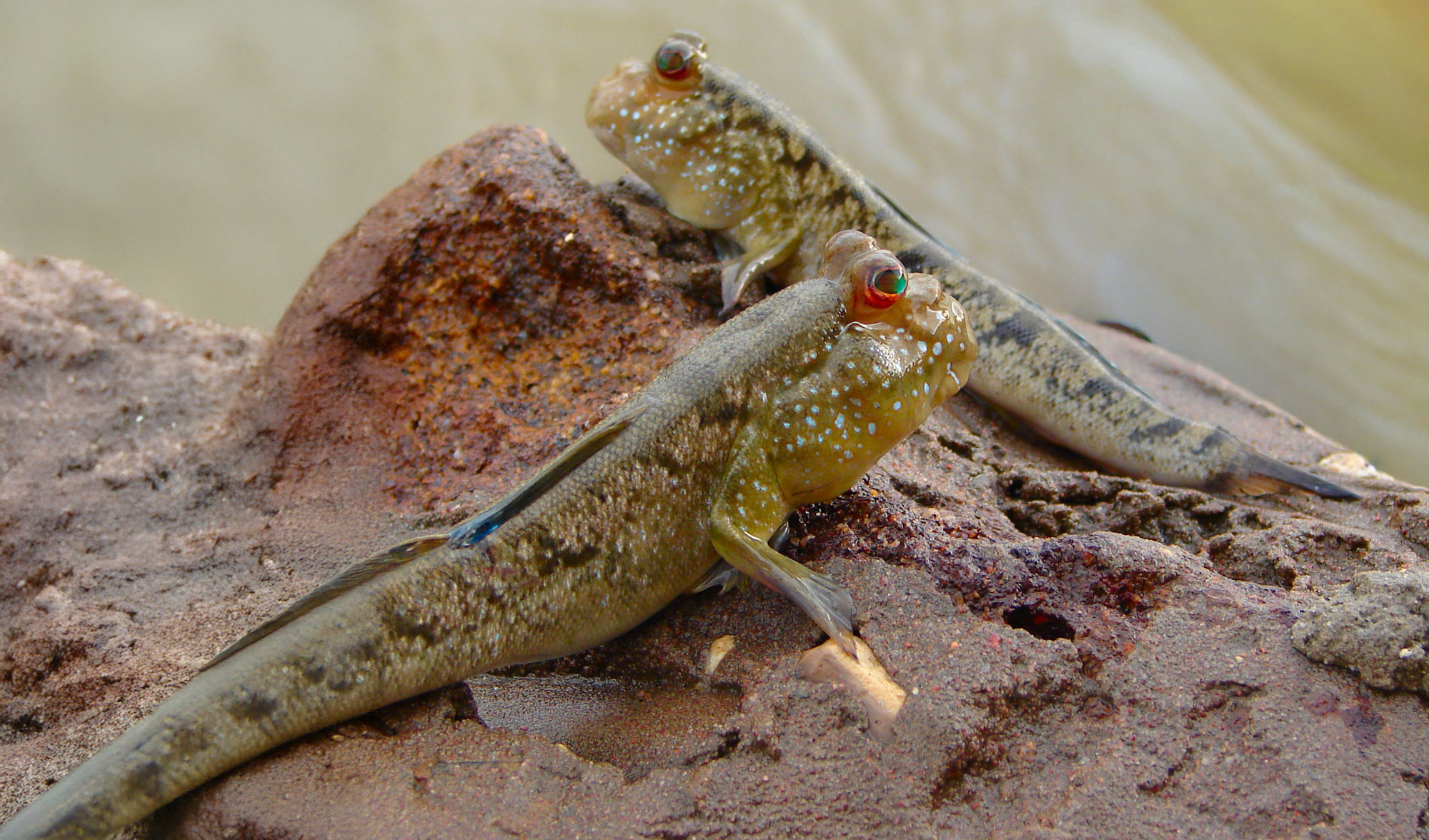 Schlammspringer verdanken ihren Namen ihrer Fähigkeit, zu laufen, zu klettern und aus dem Wasser zu „hüpfen“. Der Schlammspringer widerspricht fast allem, was wir über Fische wissen. Er atmet nicht nur durch Kiemen, sondern auch über seine Haut, kriecht über Wurzeln und kann auf Äste klettern. Er lebt im Grenzbereich – zwischen Wasser und Land, Ebbe und Flut. Dort, wo andere Arten kaum überleben, hat er ein eigenes kleines Reich geschaffen. Seine Augen sitzen oben auf dem Kopf und können unabhängig voneinander sehen – ideal für den Überblick über Luft und Wasser zugleich.