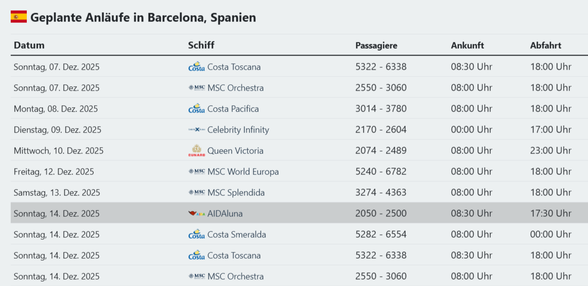 Ein Anlegen in Barcelona ist sehr beliebt. Die Stadt (Ramblas) ist recht gut zu erreichen. Und die weihnachtliche Stimmung ist sehr verlockend.