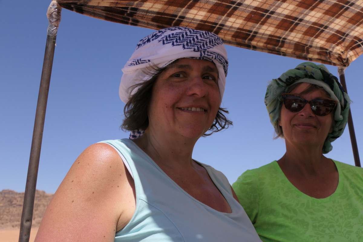 Die Frühaufsteher wurden auch diesmal belohnt, als die Sonne hinter den Bergen langsam aufging und unser Camp anstrahlte. Nach dem üppigen Frühstück warteten schon junge, freundliche Beduinen darauf, uns mit ihren Jeeps durch die Wüste zu chauffieren. Es waren nicht gerade die neuesten Modelle, aber fahr- und wüstensandtauglich. Und überdacht! Die Fahrer hatten regelrecht Spaß am Beschleunigen und daran, sich gegenseitig zu überholen, und wir genossen den Fahrtwind und die Landschaft, die sich nach jeder Kurve ein wenig änderte. Den meisten gefiel es sehr, barfuß auf dem feinen, noch nicht ganz heißen Sand, zu laufen, mancher zog es vor, darauf zu liegen. Die sportlichsten liefen die Düne hinauf, um einen Blick auf die herrliche, weite Landschaft zu werfen.