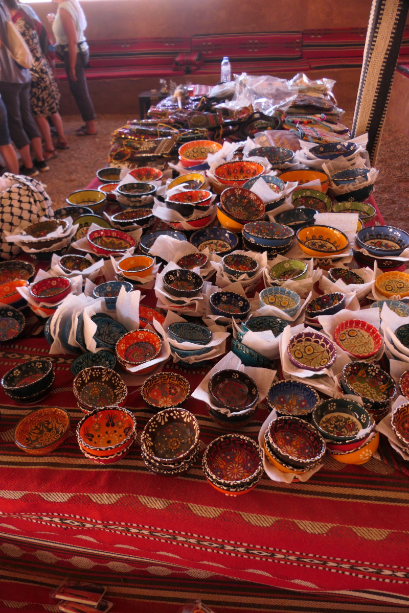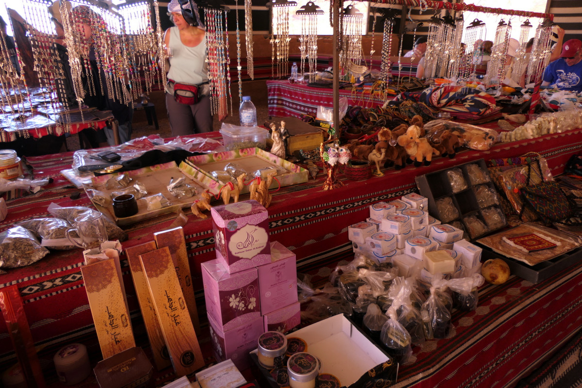 Unterwegs hielten wir an einem Kamelsammelpunkt, um noch einmal diese sympathischen Tiere (einschließlich der Baby-Dromedare) aus der Nähe zu beobachten (sogar beim Pinkeln, ein seltener Anblick!) und auch um die prähistorischen Felszeichnungen zu bewundern – entziffern konnten wir sie nicht. Am „Ziel“ der Fahrt erwarteten uns heißer Tee und der Beduinenshop, der mit Seidentüchern und ähnlichen Kostbarkeiten jedes Mal eine besondere Anziehungskraft auf unsere Reiseteilnehmerinnen ausübt.