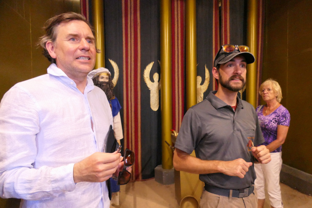 Wir konzentrierten uns hier auf die Besichtigung eines 1:1 Nachbaus der Stiftshütte, die das transportable Heiligtum des Volkes Israel während der Wüstenwanderung war. Wir bewunderten die schönen Farben, staunten aber darüber, wie klein die Stiftshütte gewesen ist. (Der Nachbau ist übrigens in Breckerfeld, NRW, entstanden!) Dank der hervorragenden Übersetzung von Jens gewannen wir einen sehr evangelistisch-persönlichen Einblick in die Bedeutung der Stiftshütte und deren Geräte.