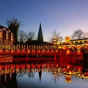 After the gloomy days of November, the Advent season brings light, atmosphere and cosiness to cities and homes. Yesterday, on Saturday evening, we took a tour of Lüneburg’s Christmas market, which is spread across several squares in the city. Thanks to the colourful lights and the ‘blue hour’, we were able to make some wonderful memories. However, it was all very crowded, with lots of buses with tourists from all over making it difficult to move through the alleyways and markets. And as always, the culinary offerings were the most popular, as evidenced by the metre-long queues in front of many stalls.