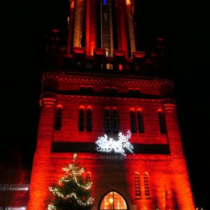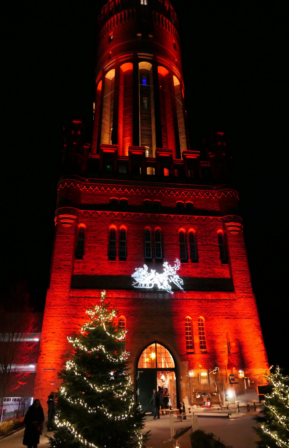 Der ehemalige, illuminierte Wasserturm (in früheren Jahren mit einem Kerzenkranz auf dem Dach).