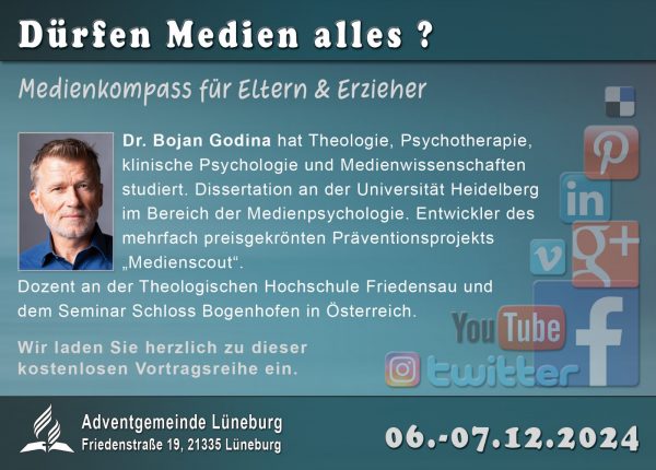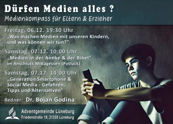 In diesem Zusammenhang bin ich sehr gespannt auf die Vorträge zum Thema „Dürfen Medien alles? Medienkompass für Eltern und Erzieher“ am kommenden Freitagabend und Samstag in meiner Adventgemeinde Lüneburg mit Dr. Bojan Godina: