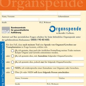 In meinen Vorsorgeseminaren gebe ich keine Empfehlung Pro oder Kontra Organspende, ermutige aber die Teilnehmer, sich mit dem Thema zu befassen, eine Entscheidung zu treffen und diese in einem Organspendeausweis (kostenlos in jeder Apotheke erhältlich) festzuhalten (zusätzlich online möglich).