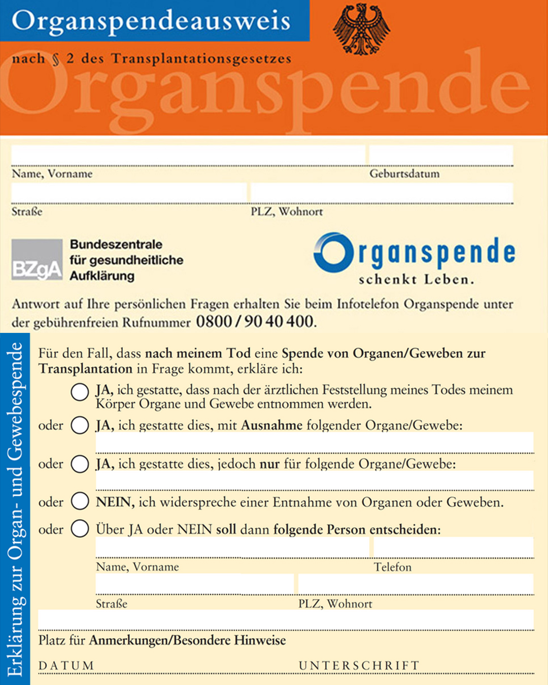 Haben viele keinen Organspendeausweis deswegen, weil sie meinen, dieser käme nur für Organspender infrage? Das ist falsch, denn auf der Rückseite gibt es fünf Alternativen zum Ankreuzen.