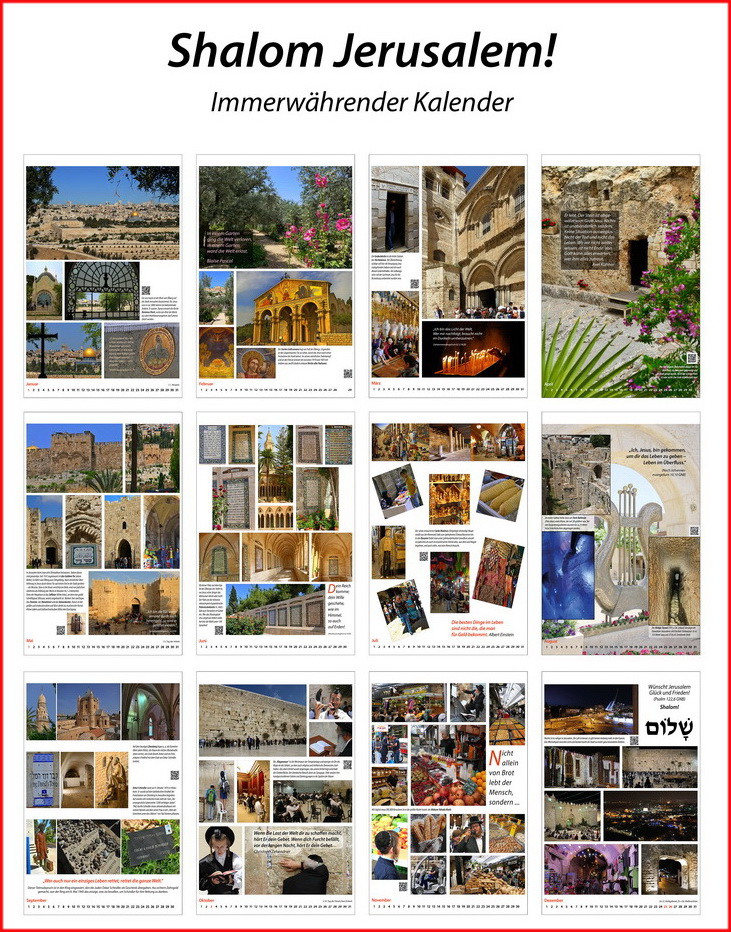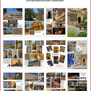 Dieser Kalender ist mehr als ein Wandschmuck. Er ist eine Einladung, diese bedeutungsvolle Stadt näher kennenzulernen für jeden, der noch nie in Israel war, oder besondere Augenblicke und Szenen in der Erinnerung aufzurufen für alle, die schon einmal dort waren.