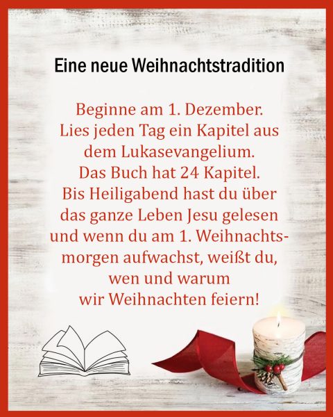 Ich befürchte, hier geht der Anlass der Adventszeit völlig unter. Dem kann wirkungsvoll entgegenwirken, wer die „neue Weihnachtstradition“ bis zum 24. Dezember folgt. Ich habe heute damit begonnen: